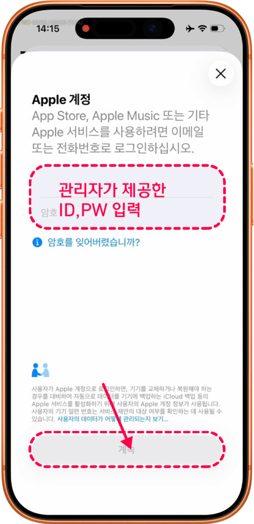 관리자 제공 하는 애플스토어 아이디와 비번을 기억한뒤 아래의 과정을 시작하세요