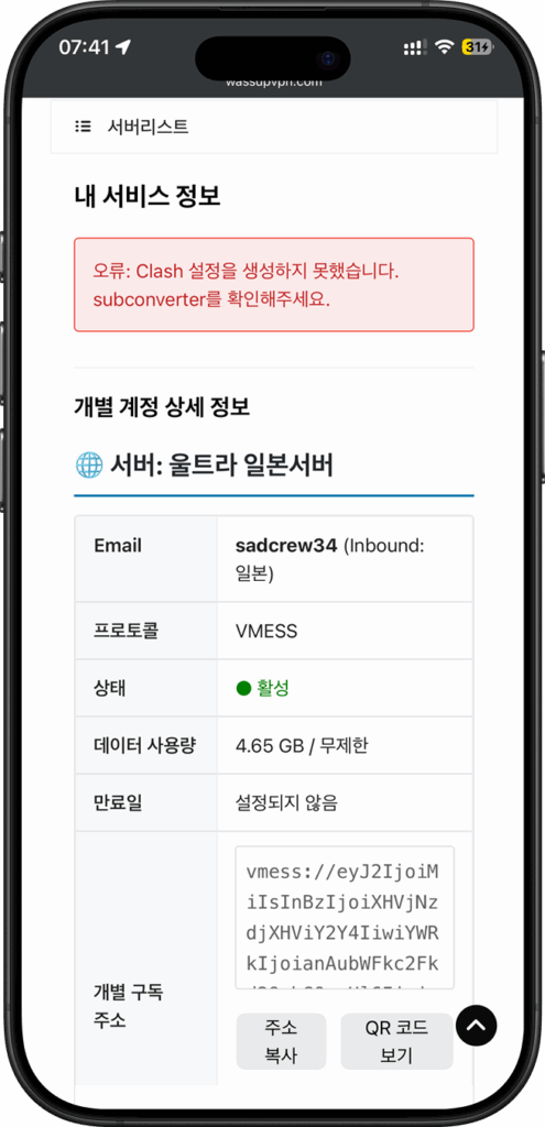 "주소 복사" 버튼을 터치합니다. 그리고 Hiddify로 이동합니다.