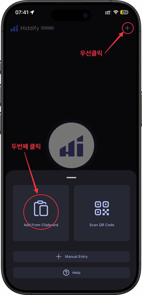 화면오른쪽 구석에 " + " 버튼을 터치 합니다. 그뒤 Add From Clipboard 를 터치 합니다.